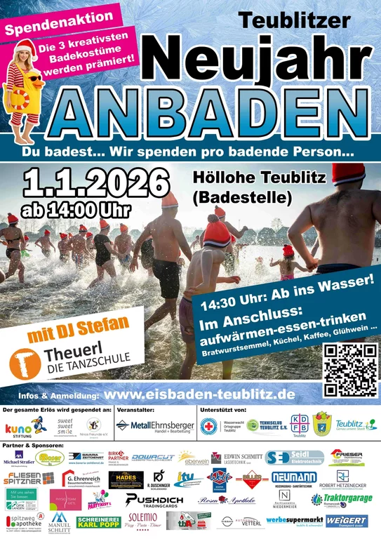 Das Neujahrsanbaden ist als eine Benefizaktion angelegt, bei der sich Unternehmen, Vereine und Privatpersonen beteiligen können. Sei es in Form von pauschalen Spenden, Beiträgen pro Teilnehmer oder mit Sachleistungen. Anmeldung für Teilnehmer und Unterstützer online www.eisbaden-teublitz.de.